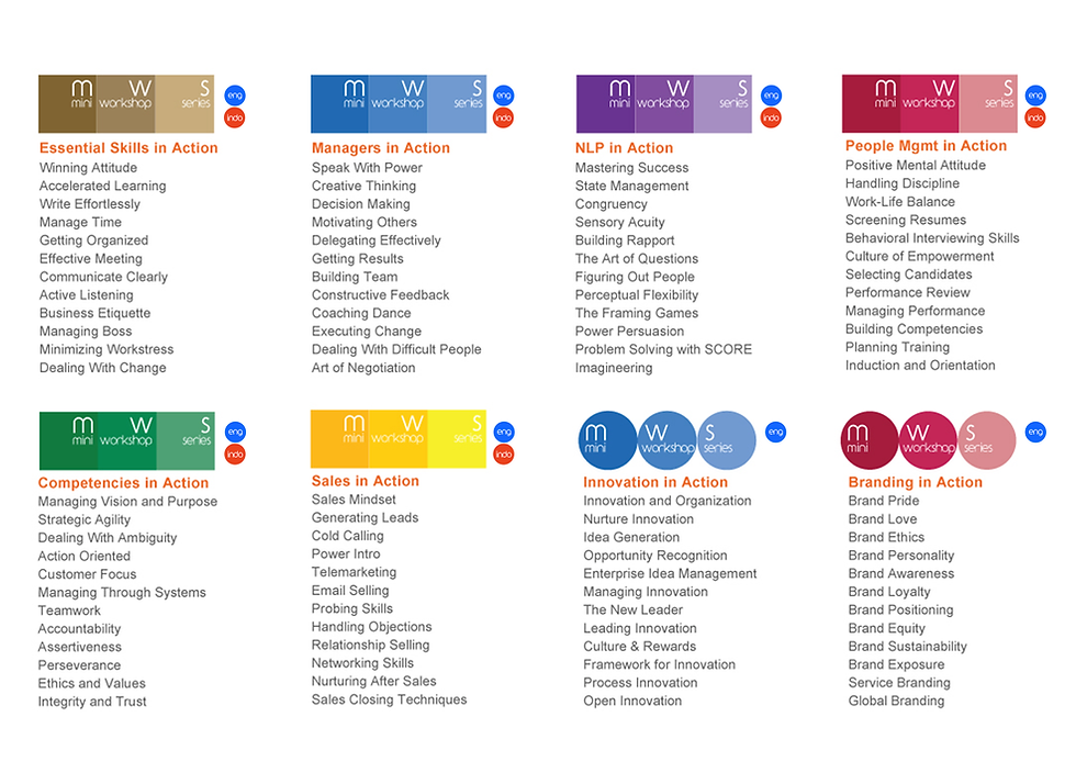 MiniWorkshopSeries™ Indonesia menawarkan pendekatan baru dan perspektif baru untuk training – training yang berbasiskan kompetensi. Modul – modul training dari MWS Indonesia dibuat untuk memenuhi setiap kebutuhan training untuk meningkatkan performa perusahaan.